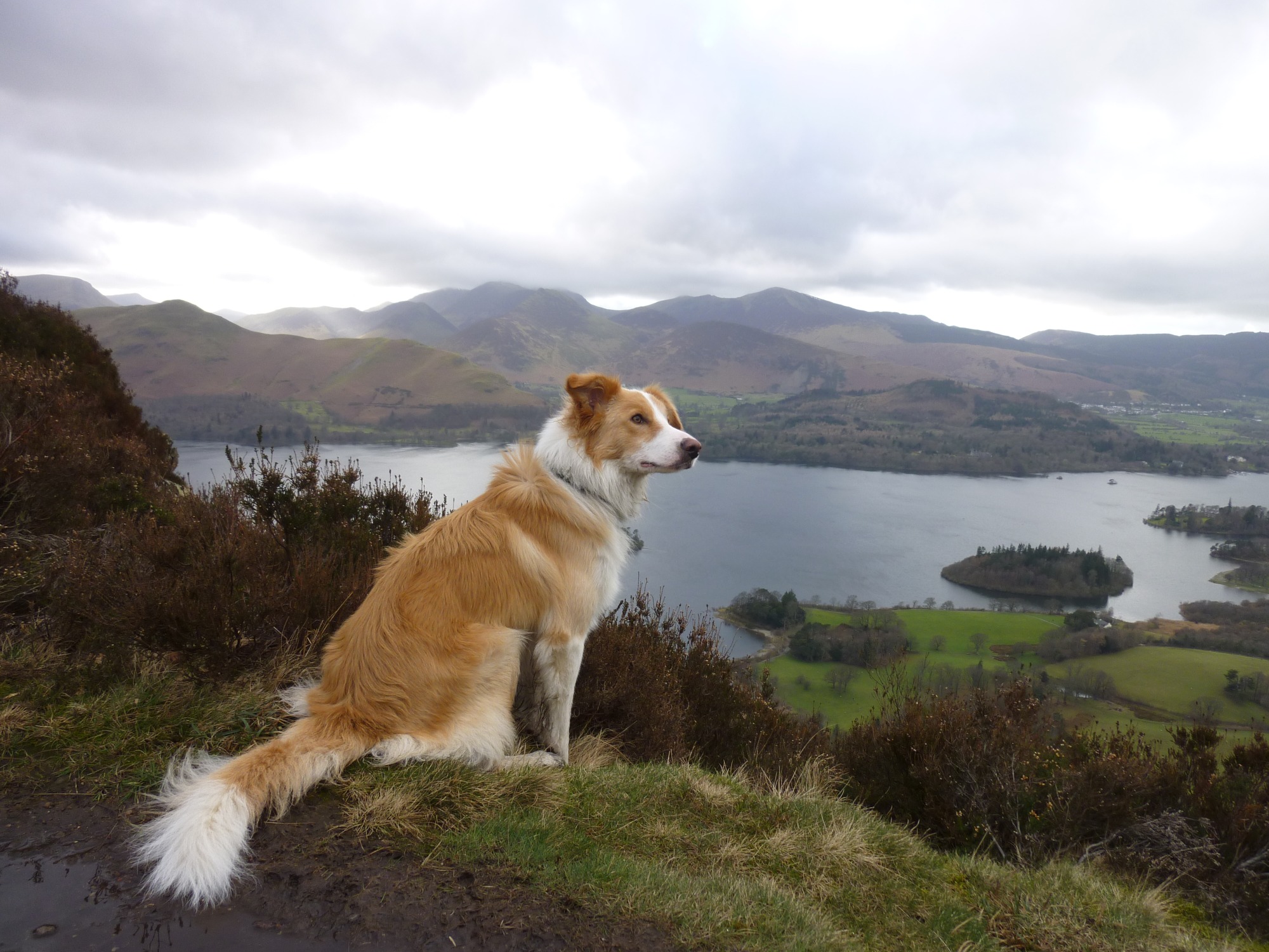 A dombon ücsörögve és csak a gazdira figyelve. Vagy csak épp valami elterelte a figyelmét? Alatta a nagy mezőség, ahol kedvére terelhet és a tó, ahol úszkálhat. Gyönyörű négylábú, bár a farka végét sikerül összesározni, ha már a pocsolya mellé ült le.