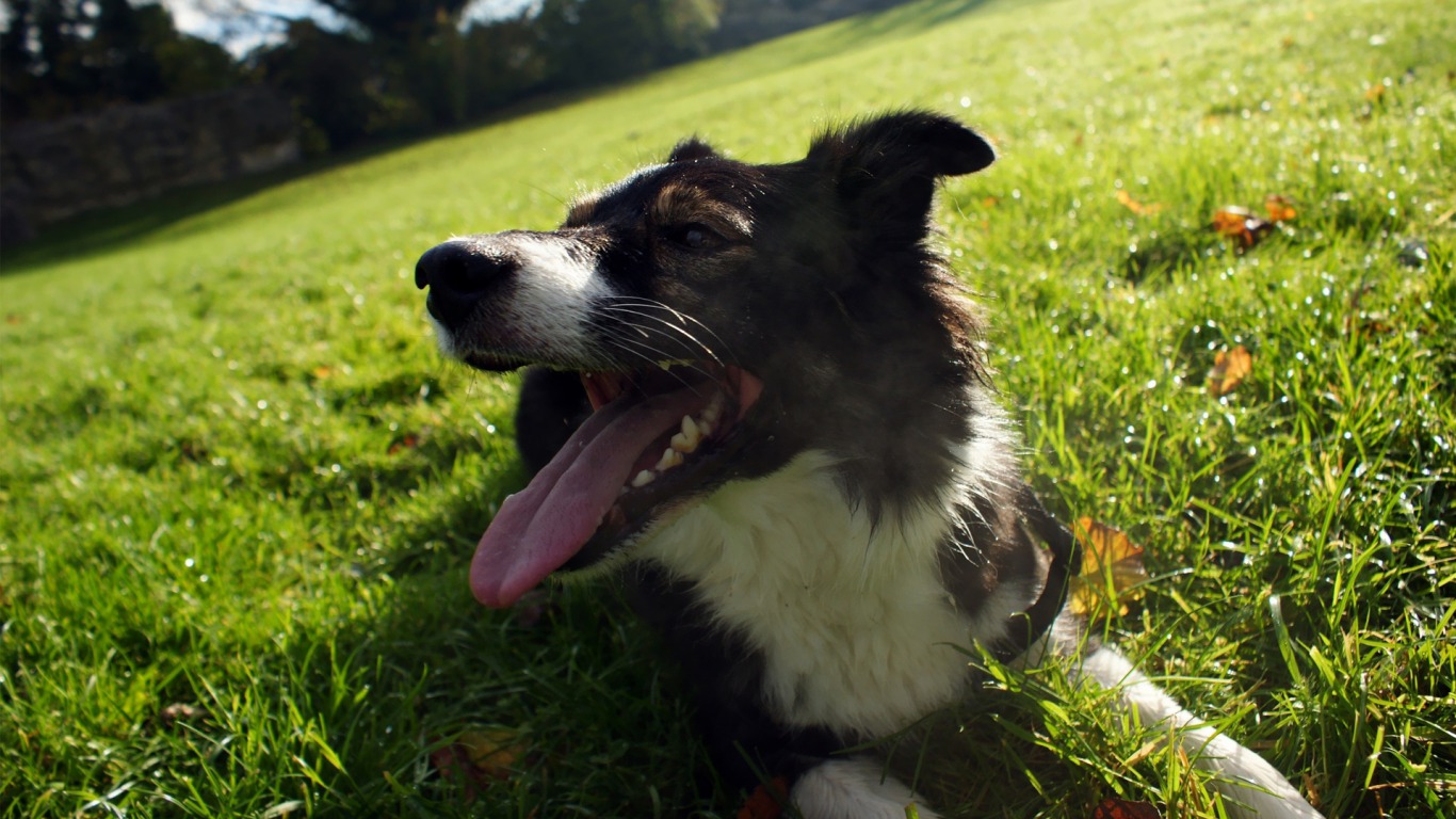Egy közeli kép egy kedves és mosolygós border collie-ról. Lehet már túl van egy remek kis sétán és végre lepihenhetett eme gyönyörű zöld réten.