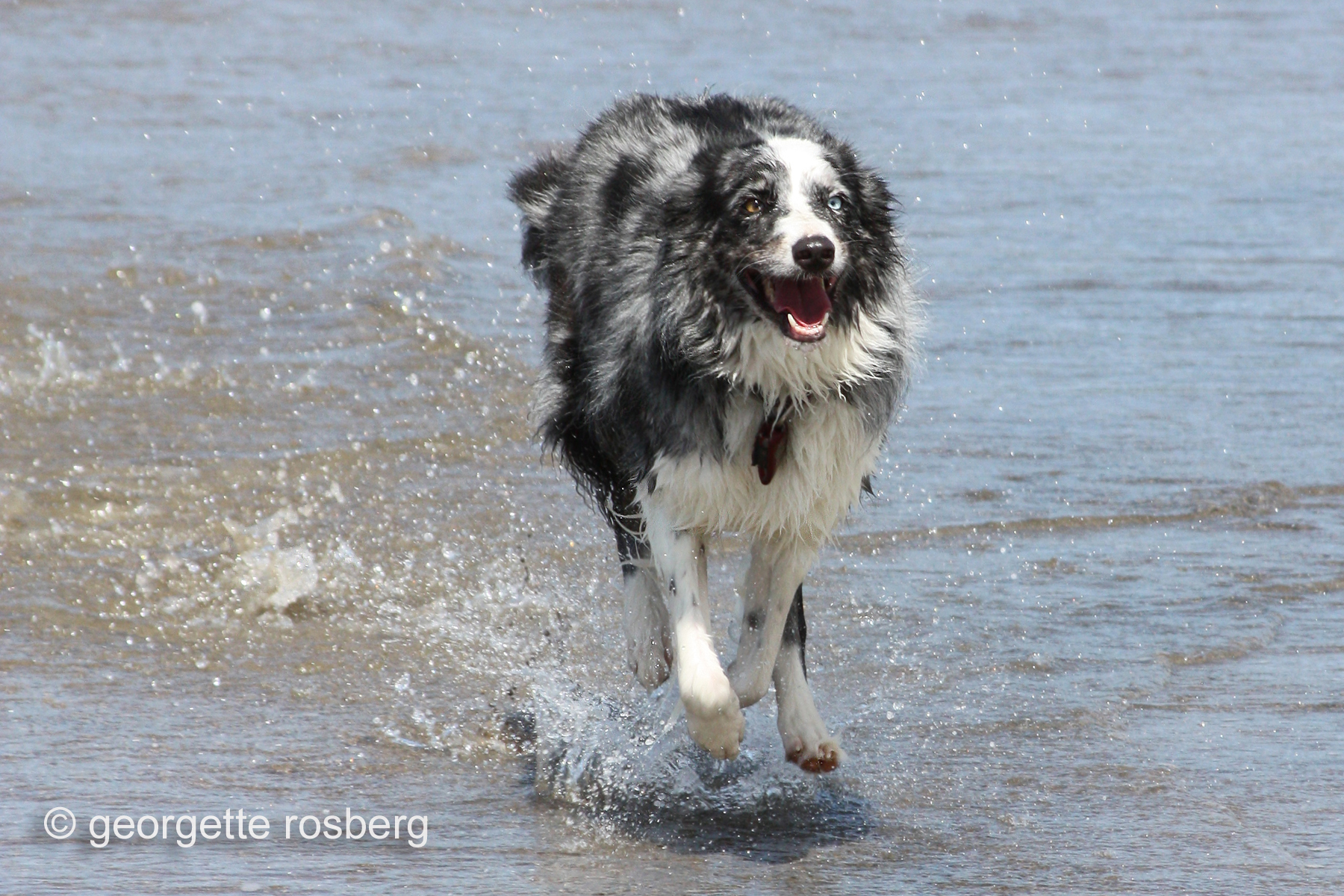 Tess egy igazi vizen járó kutya. Ez a blue merle border őrülten tud nemcsak a mezőkön végigloholni, de a vizen is simán veszi az akadályokat, és a folyékony közegnek láthatóan jobban örül. :)