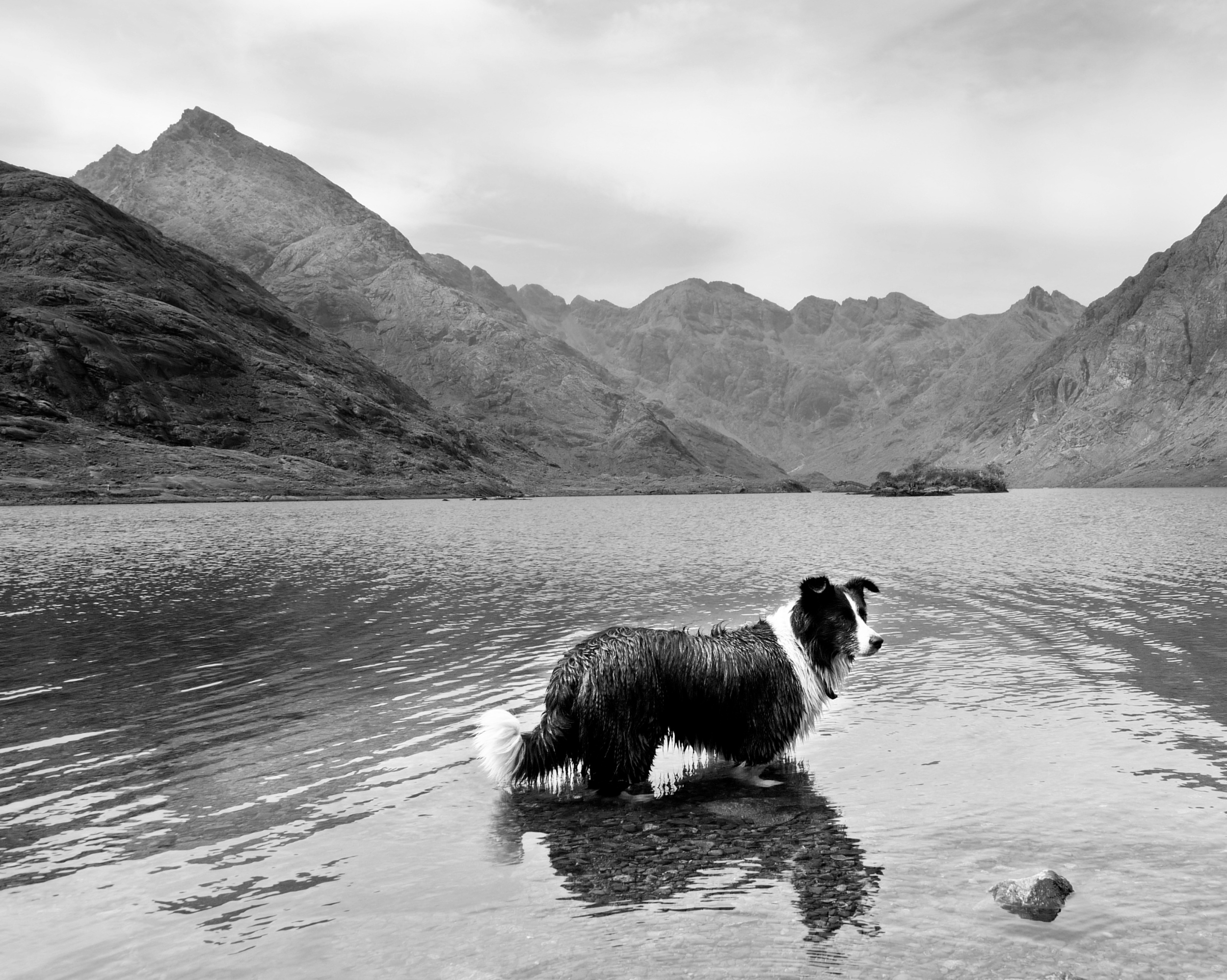 Egy kutyus ácsorog a vízben, már-már megmártózva a tóban. Kellemes lehet a mancsokat a hűs vízben tartani, miközben a lágy szellő szárítja a bundáját. Fekete-fehér kép, vízzel, hegyekkel és a nélkülözhetetlen borderrel. :)