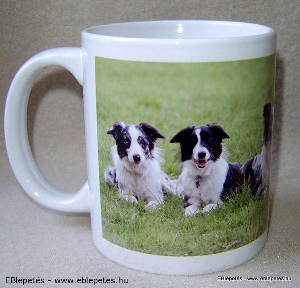 Fehér színű bögre, amelynek oldalát hat border collie-t ábrázoló fényképpel díszítettük meg.