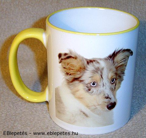 Fehér színű bögre, sárga füllel és peremmel, amelynek a két oldalát border collie portrés fényképpel, és egy kutyamancs lenyomattal díszítettük meg.